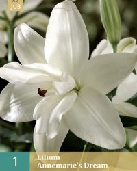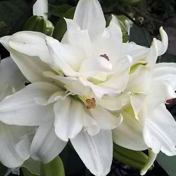 De lelie spreekt al eeuwen tot de verbeelding van de mensheid: in de bijbel als symbool van de schoonheid, in de Middeleeuwen als symbool van maagdelijke reinheid. De bloem geeft op een halfschaduwplaats in uw tuin een effect van verstilde schoonheid .… Oriëntaals Dubbele Lelie, 100 cm hoog. De heerlijk geurende, spierwitte bloemen zijn fraai gevuldbloemig zoals een waterlelie! Een droom komt tot werkelijkheid…