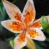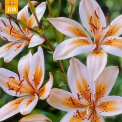 Aziatische Lelie, 90 cm hoog met aan elke bloemstengel een tros bloemen met vrij slank, spits bloemblad. Helder en warm van kleur: zilverwit met in het midden twee oranje strepen en in het centrum de kenmerkende kastanjebruine spikkels.