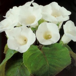 Pronkgrage kamerplant met grote opstaande klokbloemen en groot behaard basisblad. Vroeger de topper van moederdag… Zuiver wit.