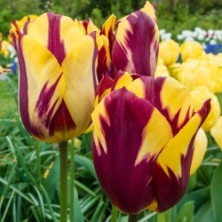 Een type tussen laag en hoog in. Behoorlijk stevig, ideaal als hogere borderbloem en natuurlijk ook als snijbloem. Keivrolijk, die kleuren: geel met diep wijnrode aders.
