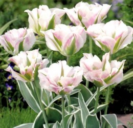Stevige tulpen met groene of zwarte lengte-strepen midden op elk spits bloemblad. Het totaalbeeld is een zeer aparte tulp! Wit, zachtroze en groen sieren de frisse bloem… de basis is al fraai: groen blad met witte randen.