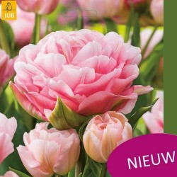 Grote zeer dubbele bloemen (als pioenrozen), die in mei bloeien. Geef ze een beschutte plek, ze bloeien lang. De kleur van deze opvallende, langbloeiende tulp is het best te omschrijven als appelbloesemroze, wat betekent dat ze in verschillende tinten roze tot wit gekleurd zijn. Geen twee zijn precies hetzelfde!