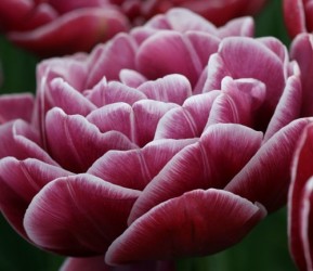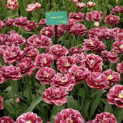 Grote zeer dubbele bloemen (als pioenrozen), die in mei bloeien. Geef ze een beschutte plek, ze bloeien lang. EXCLUSIEVE TULP! Voor een gegarandeerde ‘wow’-factor in de tuin: dieppurperen basis met helderwitte omranding.
