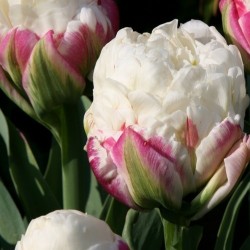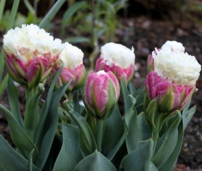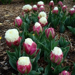 EXCLUSIEVE TULP! Deze tulp moet je gewoon elke dag volgen en het wonder ervaren… De start is een bolle, dikke knop, die verkleurt van groen naar purperroze met groene strepen. Vervolgens groeien vanuit het centrum een hele bundel witte bloembladen uit. Voordat deze zich ontvouwen worden ze als het ware ingeklemd door het purperroze omhulsel. In dat stadium is het net een portie ijs! Uiteindelijk winnen de witte bloembladen het en komt het grote witte centrum zichtbaar…