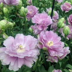 Grote zeer dubbele bloemen (als pioenrozen), die in mei bloeien. Geef ze een beschutte plek, ze bloeien lang. EXCLUSIEVE TULP! Imposant in de knop en overweldigend in volle bloei! Deze superdubbele tulp toont zijn lichtlila bloemblad met bijna wit uiteinde.