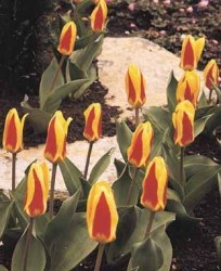 Vroeg bloeiend, korte stelen en grijsgroene bladeren, vaak decoratief gestreept. Rood-geel, breed blad.