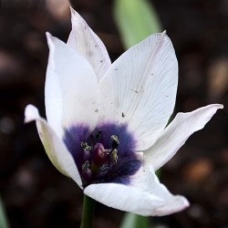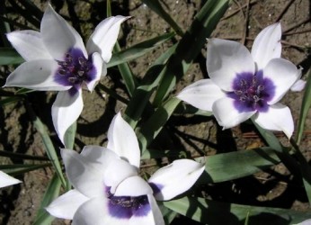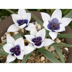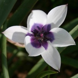 Waarlijk een van de mooiste wilde tulpjes, een dwergje van slechts 4-6 cm hoogte, met opvallende stervormige, zilverwitte bloemen en een staalblauw hart. Dit soort is door de jaren heen verkocht onder verschillende namen, waaronder T. violacea pallida, T. pulchella coerulea-oculata, T. pulchella albocoerulea oculata, T. pulchella pallida, en nog andere variaties. Ze groeien zowel in de zon als in de schaduw, hoe meer schaduw hoe langer het stengeltje. Een ideaal tulpje voor ons klimaat, ze bloeien in maart en april.