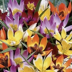 Oorspronkelijk "wilde" soorten (ook wel Tulipa species genoemd), vaak blijvertjes in de tuin, kleinere bloemen. Een ontdekkersmengsel van minimaal 5 wilde tulpensoortjes. Alle gebruikte soorten voor dit mengsel zijn extreem laag.