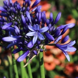 Deze Agapanthus heeft een mooie dubbelkleur: donkerblauw aan de buitenkant (en in de knop) en lichtblauw van binnen. De hoogte van een volwassen plant is 70 cm. Redelijk winterhard, enige bescherming bij strenge vorst is wel nodig.