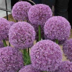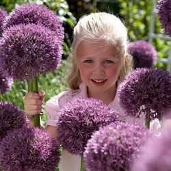 Een unieke reus, ontstaan uit een (bijen)kruising tussen de Allium christophii en de Allium macleanii op de proefvelden van Jan Bijl. De bolvormige bloemtros krijgt een doorsnee van wel 20 cm en bevat ongeveer 1500 paarsviolette bloemetjes. De hele maand juni kleurt deze gigant de tuin om vervolgens nog maandenlang sierlijk op te drogen… Het blad blijft tijdens de bloei groen, dat is uniek!
