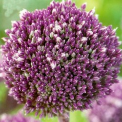 Bijzonder vanwege de kleur: paarsrood en de bloeitijd: juli-augustus. In het uitbloeistadium zijn de witte meeldraden duidelijk zichtbaar. De enorme (15 cm grote) bolvormige bloeiwijze is zeer vast en compact en doet denken aan de bekende trommelstok-uitjes (Allium sphaerocephalon), maar dan in het groot. Het blad blijft lang fris en de sterke, paarsgekleurde stengels worden wel 175 cm lang, met uitschieters (op vruchtbare klei) van 250 cm! Een ware hemelbestormer…