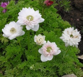 Verreweg de bekendste Anemoon, geliefd als snijbloem en al in 1850 vanuit Frankrijk in ons land geïntroduceerd. Er zijn twee bekende typen: het De Caen-type met grote, fraai gekleurde, enkelvoudige bloemen en het St.Brigid-type met halfgevulde bloemen en vrij smalle bloemblaadjes. Verlangen voedzame humeuze grond en met enig winterdek is de plant voldoende vorstbestendig. Voor het planten de knolletjes een nachtje in water weken. Dubbelbloemig wit met groen hart.