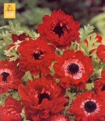 Verreweg de bekendste Anemoon, geliefd als snijbloem en al in 1850 vanuit Frankrijk in ons land geïntroduceerd. Er zijn twee bekende typen: het De Caen-type met grote, fraai gekleurde, enkelvoudige bloemen en het St.Brigid-type met halfgevulde bloemen en vrij smalle bloemblaadjes. Verlangen voedzame humeuze grond en met enig winterdek is de plant voldoende vorstbestendig. Voor het planten de knolletjes een nachtje in water weken. Dubbelbloemig (wel met een zichtbaar, bijna zwart hart) scharlakenrood met witte ring rond het hart.