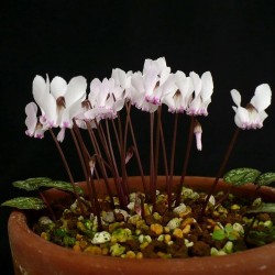 Het is niet zo’n kunst om zeldzame cyclamenknollen aan te bieden. Wel of niet uit de natuur geroofd, is er wereldwijd een levendige handel. Jammer dat maar een deel van de knollen het echt goed doen in de tuin. Wij hebben voor u de oplossing: elk soort dat we leveren wordt in Nederland in een pot gekweekt en heeft al blad (gegeven), zodat we hergroei durven garanderen! Bij het uitplanten de potgrond uit de potjes vermengen met de grond in de omgeving anders kunnen de knollen te nat blijven. HERFSTBLOEIEND. Prachtig soort uit het eiland Cyprus, waar hij groeit in de dennen- en cederbossen van het Kyrenia- en Troodosgebergte. De sterk geurende bloemen die verschijnen in de herfst, zijn wit tot zeer lichtroze met een paarsachtige vlek aan de basis. De rijzige bloemblaadjes met gedraaid uiteinde hebben aan de basis aan weerszijden een duidelijk oortje. (tekst: Wikipedia)
