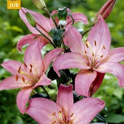 Aziatische Lelie, 80-90 cm hoog met aan elke bloemstengel een tros bloemen met vrij slank, spits bloemblad. Pittig roze aan de buitenzijde naar lichtroze in het centrum. Plant de bollen 15-20 cm diep in grond dat goed verbeterd is met potgrond en/of compost.