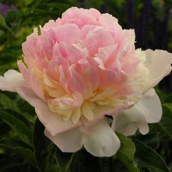 (1975) Het zachtroze centrum wordt omgeven door een crèmegele schotel. Dubbelbloemig, tot in het centrum gevuld, met iets groter buitenblad: de schotel. Plantopbouw is rechtopstaand en vrij smal, 1m hoog. Bloeit eind mei.