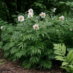 (1939) Al vroeg in het seizoen (april-mei) bloeit deze fantastische witte, enkelbloemige pioenroos! Stevige stengels, fraai ingesneden blad en volop sterke witte bloemen (2-4 per stengel!) met zichtbaar warmgeel hart. Geef ze zon tot half schaduw, hoogte 90 cm. Dit sterk groeiende ras is voortgekomen uit kruisingen tussen P. emodi en P. veitchii.