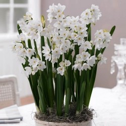 Al bijna een halve eeuw een echte “must” in de huiskamer zijn deze witte trosnarcisjes. Vroeger kwamen ze uit Frankrijk, tegenwoordig worden de beste in Israël geteeld en importeren wij ze dan ook daar vandaan. Gemakkelijk te telen (met duidelijke teeltaanwijzing). Inbal ® is de enige paperwhite die vrijwel niet geurt: ideaal voor degenen, die niet tegen de lucht kunnen, over geur valt ook al niet te twisten!