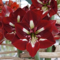 REUSACHTIGE BOLLEN! Deze grootbloemige Amaryllis heeft de grootste bolmaat die we kunnen krijgen en geeft gegarandeerd 3-4 bloeistengels met elk 4-6 bloemen. Zeer donkerrood met helderwitte vegen vanuit het centrum.