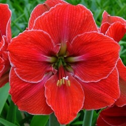 REUSACHTIGE BOLLEN! Deze grootbloemige Amaryllis heeft de grootste bolmaat die we kunnen krijgen en geeft gegarandeerd 3-4 bloeistengels met elk 4-6 bloemen. Egaal rode kleur met subtiele witte rand!