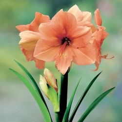 REUSACHTIGE BOLLEN! Deze grootbloemige Amaryllis heeft de grootste bolmaat die we kunnen krijgen en geeft gegarandeerd 3-4 bloeistengels met elk 4-6 bloemen. Het zachtste zalmroze is betoverend!