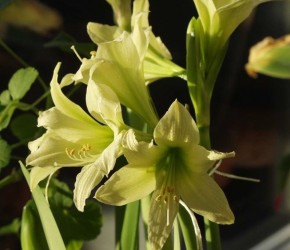 KLEINBLOEMIG. De meer verfijnde amaryllis, geeft 2 bloeistengels met elk 4 bloemen, spitser van vorm, kortere stengels. Bijzondere citroengele tot limegroene kleur.