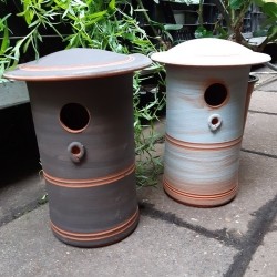 Cylindervormige terracotta pot met gedekte kleurtjes en los deksel, waardoor deze gemakkelijk schoon te maken is en waardoor je stiekem kan kijken als de oudervogels gegarandeerd weg zijn. Zeer heet gebakken, waardoor vorstbestendig. Het invlieggat is 30 mm, ideaal voor kleine meesjes en andere kleine vogels. Onder dit gat is een houdertje om eventueel een aanvliegstokje te bevestigen (voor mezen niet nodig). Onderaan is de bodem plat en bevindt zich een gaatje voor afwatering. Aan de achterzijde zijn gaatjes uitgespaard om de pot gemakkelijk op te hangen.