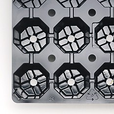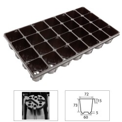 De plaat is 56,2x31,5x7,8 cm en elk potje heeft een drainage-gat met slimme afvoergootjes. Voor de kweker: 158 planten per m².