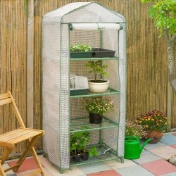 Stevige kunststof kast van buizenframe en 4 metalen roosters als stapelniveau's. Het geheel kan worden omgeven door een hoes van gewapend folie, die UV gestabiliseerd is. De voorzijde kan d.m.v. een dubbele rits omhoog worden gerold. Een ideale kas(t) voor: zaaien, afharden of overwinteren van planten op een kleine plek! Geleverd als bouwpakket en weer gemakkelijk uit elkaar te halen. Afm hxbxd: 160x69x49 cm.