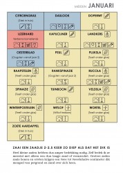 Alle informatie is gebaseerd op ruim 25 jaar moestuinervaring van auteur Diana Stek. Alle soorten die aan bod komen zijn daadwerkelijk door haar geteeld. In haar persoonlijke, droge stijl schrijft ze over de vriesdood van bonenkevers, het geluid van een watermeloen, het nut van gebroken bezemstelen en over aardappelenlogica. Maar ook over man Ruud die haar manier van uien poten wat te rommelig vindt: heb je ze laten vallen? In de Zaaiagenda voor de Moestuin vind je meer dan 2000 zaaischema's van ruim 175 soorten. Maar ook 12 columns van Diana's hand, ruimte voor eigen aantekeningen en meer dan 50 moestuintips. Nog wat meer informatie: Vol trots presenteren Diana en Laura deze ZAAIAGENDA VOOR DE MOESTUIN. Het ambitieuze project begon als een lolletje. Diana, bekend van de eindeloze hoeveelheid moestuin-blogs met waardevolle kennis op www.mooiemoestuin.nl heeft een zaaikalender op haar website staan. Laura wilde die voor haar zelf in een iets overzichtelijker vorm gieten en benaderde Diana of zij ook een exemplaar wilde. Na een gezellig gesprek aan de telefoon werd het plan voor de ZAAIAGENDA geboren. Het klikte tussen de twee. Binnen de vruchtbare samenwerking is de taakverdeling helder: Diana schrijft de teksten en zorgt voor de zaai informatie. Laura doet de vormgeving en het zakelijke deel. De ZAAIAGENDA VOOR DE MOESTUIN van Diana en Laura onderscheidt zich door zijn eenvoud. Er zijn talloze tuinboeken geschreven en bestaan ook vele soorten moestuin-planners. Wat uniek en ideaal aan deze agenda is, is dat de gegevens gerangschikt zijn op tijd: is het 14 juli en vraag je je af wat je nog kunt zaaien? Pak deze prachtig vormgegeven agenda er bij, sla hem open op ‘midden juli’ en zie alle groenten, kruiden en moestuin-bloemen die je op dat moment kunt zaaien. Als je een soort tijden lang kunt zaaien, kom je hem dus herhaaldelijk tegen. Je zoekt op tijd, niet op soort. Alhoewel, dat kan ook, als je dat wil. Achterin is een uitgebreid register te vinden waar je ook op groenten, kruiden of bloemen kunt zoeken. Door het gebruik van iconen blijft de informatie compact. Bij de agenda zit een bladwijzer met daarop de legenda. Zo hoef je de icoontjes dus niet uit je hoofd te leren maar heb je de uitleg altijd bij de hand. De agenda is op een heel overzichtelijke manier gevuld met informatie over het zaaien. Wanneer zaai je wat, zaai je het binnen, buiten of onder koud glas. Wanneer kan je het uitplanten, is de bloem eetbaar, trekt hij bijen/vlinders aan, bij welk gewas hoort de groente en nog veel meer. Informatie over het verzorgen van de planten of het onderhouden van de moestuin staat er niet in. Deze informatie is te vinden op Diana’s uitgebreide website. De agenda is simpel, eenvoudig en onmisbaar voor zowel de beginnende als ervaren moestuinder. De ZAAIAGENDA VOOR DE MOESTUIN is gedrukt op prachtig gerecycled papier van zeer stevige kwaliteit. Er staan vele tips in, twaalf verhalen van Diana in haar karakteristieke, vrolijke en toegankelijke stijl. En er is op veler verzoek ruimte voor aantekeningen. Leveringsmaandenhet gehele jaar