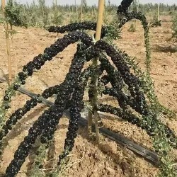 De Gojibes hebben we nu ook in het zwart! Glimmend zwarte, zoetzure, zachte bessen aan sterke, vorstbestendige planten. Uit de Chinese traditie (die nog springlevend is!) een veelgebruikte plant: de bessen en wortels beloven veel gezond makende en gezond houdende werkingen, zelfs nog beter dan de rode! De plant groeit met lange takken, die steun nodig hebben (net als bramen) en ook lange doorns bezitten. Zet ze zonnig of half beschaduwd op een voedzaam en niet te natte plaats, ze groeien gemakkelijk en zijn zeer vorstbestendig. Planten zijn zelfbestuivend, dus 1 plant is voldoende voor vruchtzetting. Tenslotte nog enkele toepassingen in de (Chinese) keuken: In rijstepap, in soepen, met kip, in de wok, voor een gezonde kruidenthee, men maakt er wijn of bier van en de jonge scheuten worden als spinazie gekookt. Verder wordt er rechtstreeks sap uit geperst voor een gezond makende sapdrank. Maak er echter geen dagelijks drankje van, want overdaad schaadt. De planten kunnen vanaf het derde jaar bessen geven, mits de standplaats goed is. Hoe meer zon hoe beter en de grond moet goed doorlatend zijn en niet nat blijven na regen…