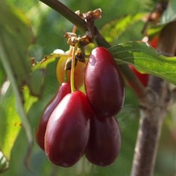 Deze rassen geven grote, peervormige bessen: donkerrood, sappig, zoet en aromatisch! Ze rijpen tamelijk vroeg, in augustus en vallen niet meteen af bij rijping. Voor onderlinge vruchtzetting plant je een ander ras Kornoeljekers (Cornus mas) of een Japanse Kornoelje (Cornus officinalis) in de buurt. (We leveren 1 van de 2 rassen)