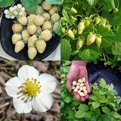 Onze collectie aardbeien bestaat voor een deel uit zeldzame oude rassen, die slechts mondjesmaat leverbaar zijn. In juli wordt jaarlijks een nieuwe teelt door onze kweker opgepot, welke in september wordt geleverd. In april-mei kunnen we een deel van dit sortiment aanvullen. De rankende planten geven (het liefst op een halfschaduwplekje) een redelijke oogst van crèmekleurige, kleine vruchtjes. Prettig 'wild' aroma, veilig voor vogels! (tnw)