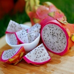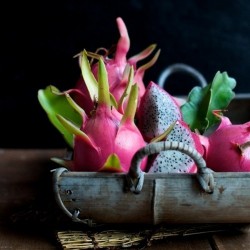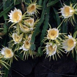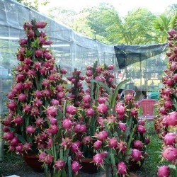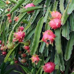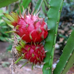 Niet veel mensen beseffen, dat de decoratieve en zeer smakelijke Drakenvrucht aan een cactus groeit! Kweek deze plant in een flinke pot, die op een pilaartje of tafel kan overhangen. Kwekerijen in de tropen binden 1-3 scheuten aan een stok van 1-3 m hoogte en toppen de planten vervolgens, waardoor productieve boompjes ontstaan. ‘s Zomers mogen de planten buiten in half zon, half schaduw (om inbranden van zon te voorkomen), bij veel regen liefst onder een afdak. ‘s Winters op een lichte, koele plaats tamelijk droog houden: in rust. Na jaren geduldige oogst komen de prachtige, witte bloemen en rozerode vruchten: rijp geplukt is het witte vruchtvlees met zwarte pitjes verrukkelijk: mildzoet, vergelijkbaar met meloen en kiwi!