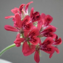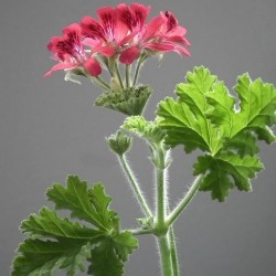 Bijna in 3 delen verdeeld en ingesneden blad en (later) ranke, roze rode bloemetjes met dieprode adertjes. Elk bloemetje is een kunstwerk! Een notig en fris aroma komt vrij na fijnwrijven van het blad.