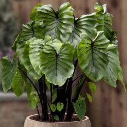 Een prachtige bladplant met enorme groene bladeren (de vorm als olifantsoren) en met scherp uitstekende, donkerpaarse nerven en stengels. Tot bloei komt deze aronskelkachtige niet in ons klimaat. Zet ze in de zomer vochtig tot nat en 's winters vorstvrij en droog (hoewel extra dek over de knollen vaak voor overleving in onze winters zorgt). De Taroknollen worden al sinds mensenheugenis in de tropen gegeten, in Azië en Afrika is de teelt enorm populair, ze bevatten 25% zetmeel en zijn vrijwel ongevoelig voor ziekten. Ze worden gekookt, geroosterd, gebakken en gefrituurd. In Afrika worden ze in een pasta (“fufu”) verwerkt. Het blad is na koken ook eetbaar (lekker om vlees of vis in te rollen). Hoogte 1m.