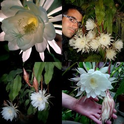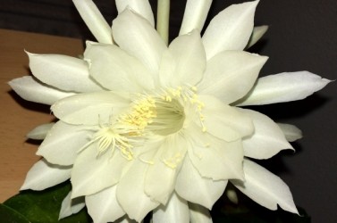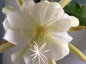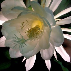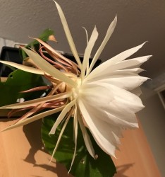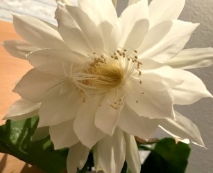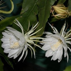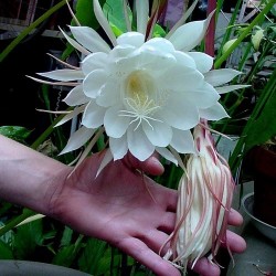 Deze tropische lidcactus kent in Azië grote populariteit, maar is bij ons niet zo bekend. Het wonder voltrekt zich ‘s zomers: dan ontstaan enkele dikke bloemknoppen, die elk 1 nacht tot volle bloei komen. De verbijsterend mooie, komvormige, maagdelijk witte bloemen verspreiden een heerlijk zoete lucht. Daar moet je bij zijn! Niet verwonderlijk, dat in India de mensen een wens mogen doen tijdens deze fantastische bloei... Dat moesten we in Nederland ook maar eens invoeren. ‘s Zomers mag de plant lekker naar buiten, ‘s winters koel overwinteren en wat armer en droger houden om de groei te remmen. De plant kan een flinke afmeting krijgen.