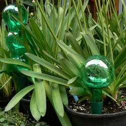 845610) is de basis van het systeem de doseerdop met ingebouwd hol koperen buisje. Draai een stijve en onbeschadigde frisdrankfles op de doseerdop. Tevoren kan de watertrechter van 12 cm lengte in de grond worden gestoken. Zorg dat er nog 2 cm boven de grond uitsteekt om te voorkomen dat deze volloopt met grond. De fles past nu met doseerdop op de trechter. Deze set bevat 3 complete sets, een trechter van 12 cm is voor bloembakken van 15-25 cm diepte. Vind je een recycle-fles niet zo fraai? We verkopen oersterke en fraai groene flessen van 1,25 liter (bestelnummer