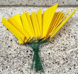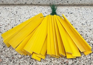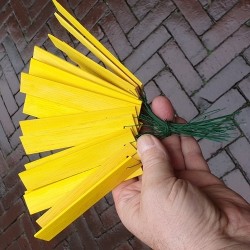 Ouderwets, maar weer helemaal duurzaam: houten, gele etiketten met aan elke etiket een 2-draads ijzerdraadje om de deze te laten hangen aan een boom of grotere plant. Afmeting etiket 12x2 cm, ijzerdraadjes elk 10 cm lang.