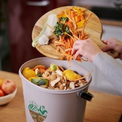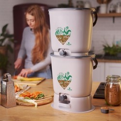 TOEPASSING: 2 emmers werkt het prettigst, zo is er altijd ruimte. Maak het GFT-afval klein en breng Bokashi Starter (850220 - apart aan te schaffen -) in laagjes aan. In ongeveer 2 weken is het fermentatieproces klaar. Tap dagelijks het verzamelde sap af, hiervoor is een kraantje gemonteerd. Dit sap is (verdund) een goede plantenvoeding. Het gefermenteerde afval is niet verteerd door oxidatie en bevat hierdoor veel meer micro-organismen: een welkome aanvulling in de tuin! De lichtgrijze emmers zijn gemaakt van 100% gerecycled plastic, inhoud 15,3 liter, ± 70 cm hoog, platrond van vorm, en 30 cm diep en 35 cm breed. Leveringsmaandenhet gehele jaar