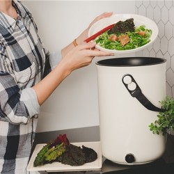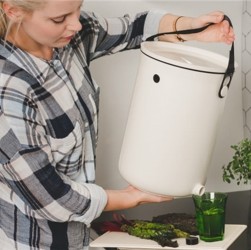 Fermenteren in plaats van kompost maken! Met de Bokashi keukenemmer fermenteer je eigen keukenafval in huis. Door keukenafval te mengen met een beetje Bokashi-starter (850220) ontstaat er waardevol organisch materiaal. De toegevoegde Effectieve Micro-organismen in de Bokashi-starter zorgen ervoor dat de aanwezige verse GFT-afval gaat fermenteren en dus niet gaat rotten. Afmetingen van de emmers: 34cm hoog en 24cm doorsnee. Hoe deze keukenemmer gebruiken Je kan zelf GFT-Bokashi maken van kleingemaakt keukenafval en iedere andere soort plantenresten. Bij een goede fermentatie krijgen rotting en stank geen kans. Bereiding:
