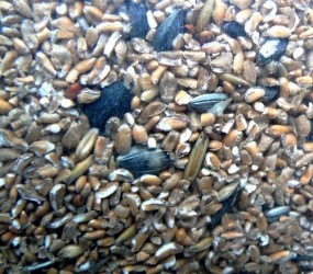 Gemengde zaden met uitgebalanceerd mengsel voor goede wintervoeding: tarwe, maïs, rode dari, geel millet, boekweit, spinazie, zonnebloempitten en raapolie.