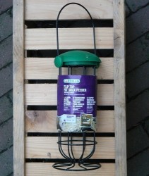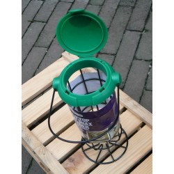 Eenvoudig bij te vullen metalen voederhouder voor maximaal 3 vetbollen/mezenbollen met plastic vulopening in de vorm van een klikdop. Zowel staand als hangend te gebruiken met met vlakke bodem en ophangbeugel.