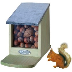 Iedereen heeft wel al eens gekeken naar eekhoorns die trainen in bomen en struiken in de tuin. Daarbij wordt al snel duidelijk dat het echt acrobaten zijn die tevens slim te werk gaan bij het bemachtigen van voedsel. Op het menu van de acrobatische omnivoor vind je bij voorkeur pinda’s, walnoten, hazelnoten en zonnebloem pitten. Tot spijt van vele vogelliefhebbers beschadigen/plunderen eekhoorns vaak de vogelvoederhuizen. Nu met dit Eekhoornvoederhuis voorkom je dit probleem en kan je tevens met veel plezier genieten van hoe de eekhoorns zichzelf bedienen. In korte tijd hebben ze ontdekt hoe ze het dakje van het voederhuis kunnen openen om bij het voer te komen. Ze zullen het ter plekke opeten of verstoppen het in de tuin om een voorraad op te bouwen voor de winter. Als beloning laten deze vlotte dieren zich eenvoudiger observeren wanneer ze aan het eten zijn.