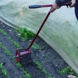 Een ideale combinatie van wieden en losmaken! Dit model is er voor gemaakt om er recht achter te lopen en dus over het zojuist geschoffelde heen te lopen. Het idee achter het schoffelen (ook met gewone handschoffel) is dat je de grond los maakt en allerlei jong onkruid daarmee loshaalt en onkruid met diepere wortel afsnijdt. Dit doe je op een droge, liefst zonnige dag in de ochtend. 's Middags als de grond gedroogd is hark je met een borderhark of grashark het onkruid bij elkaar, waarbij de gedroogde grond tussen de onkruidwortels valt en dus achterblijft in de tuin. Bij deze harkbewerking maak je dus tevens de grond netjes en loop je achteruit. Materiaal Staal. Totale lengte 1,40 m