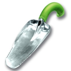 Prachtige, brede en diepe schep om grote hoeveelheden in 1 keer uit zakken of van hopen te scheppen. Heel slim zijn aan de zijkanten scherpe kartelranden aangebracht om een zak te kunnen opensnijden! Gewicht 360 g, afmeting 10x38 cm.