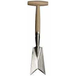 Scherpe mini-spade, die door de scherpe randen en de inkeping niet snel wegschiet! Ideaal om te planten in zware grond of om planten of kleine struikjes met flinke wortels los te steken. Totale lengte 44 cm (we leveren soms in langere maat: 59 cm), het schepgedeelte is 8,5 x 16 cm. Gewicht 470 gram.