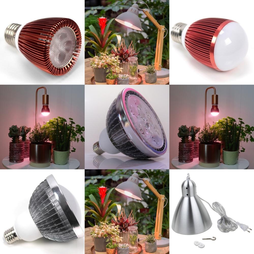 Verandert elke lamp in een groeilamp! We presenteren 4 verschillende LED-lampen, die je eenvoudig in elke beschikbare fitting draait van de hanglamp, bureaulamp, richtspot, noem maar op... 2 richtspots met een lamphoek van 60° en 2 breedstralers van resp. 120° en 130° De richtspots zijn het meest ideaal om een kleine groep planten te belichten zonder dat deze in de ogen van mensen schittert, de breedstralers zijn vooral functioneel en bedoeld voor bijvoorbeeld
