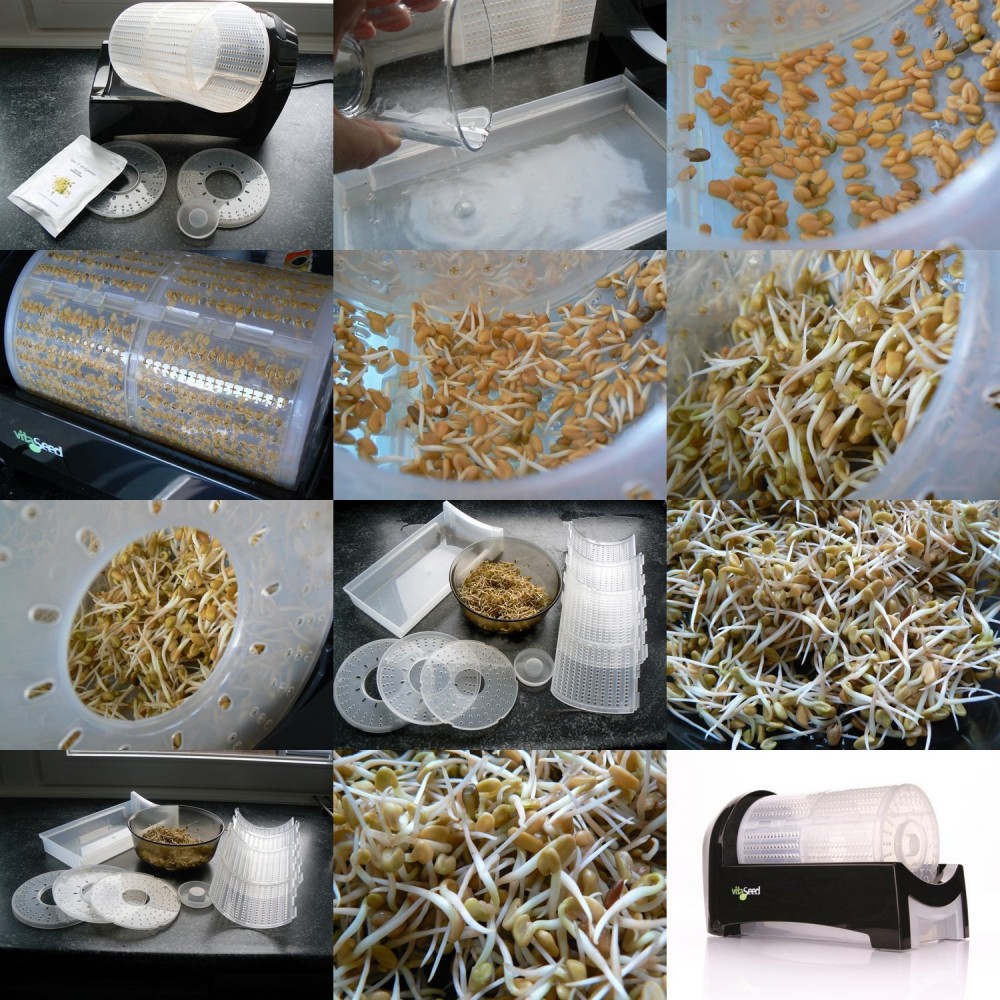 Het kweken van spruitgroenten (dus zonder aarde of matje) vergt iets meer techniek. We hebben een eenvoudig doorspoelapparaat, de Bioset en die werkt fantastisch, maar het succes staat of valt met de regelmaat waarmee je de zaden doorspoelt. Helemaal ideaal hiervoor is de volautomatische Vitaseed Kiemtrommel, een kleine uitvoering van professionele kiemtrommels, succes gegarandeerd, kijk maar eens.