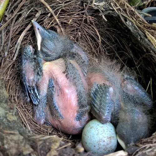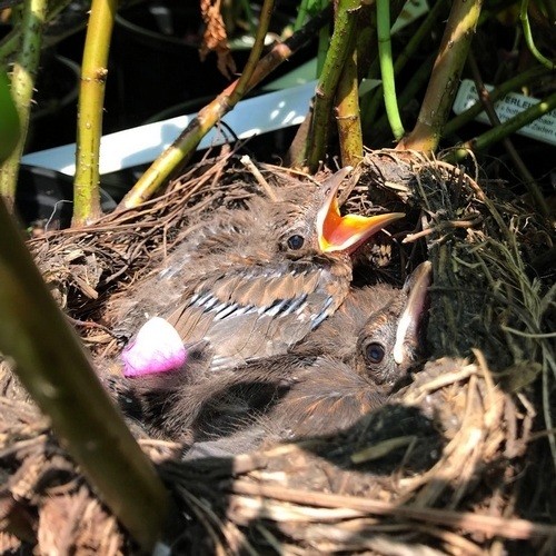 Tussen alle bedrijvigheid door (bezoekers van onze winkel kennen onze overvolle tuin) heeft het een merel-echtpaar behaagd om in een pot met een eetbare roosjes hun nestje te bouwen. Van de 4 eitjes zijn er 2 uitgekomen!